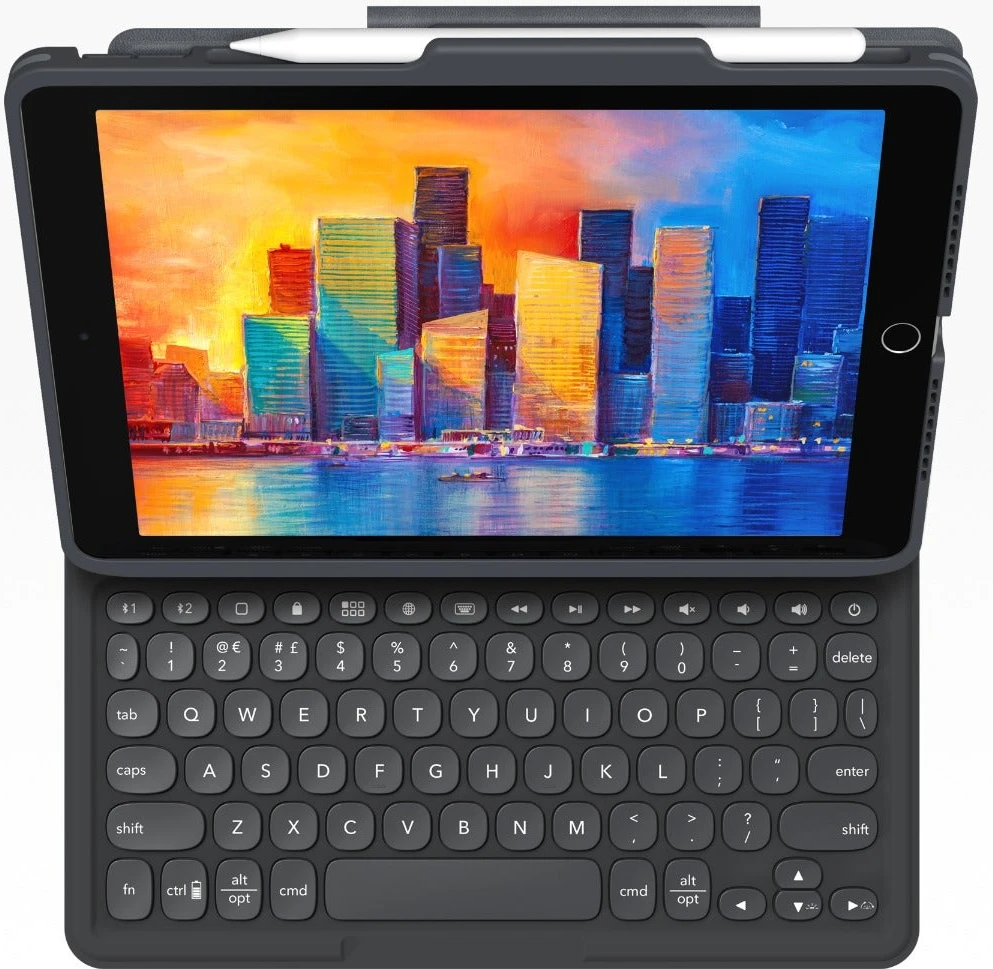 Die ZAGG Pro Keys Tastatur für Apple iPad 10,9″ (Gen 10) verwandelt Ihr Tablet in ein mobiles Produktivitätspaket. Mit einer abnehmbaren, hintergrundbeleuchteten BluetoothTastatur, einer Schutzhülle und der Kopplung mehrerer Geräte können Sie überall arbeiten, wo das Leben Sie hinführt. Diese Tastatur verfügt über Tasten im Laptop-Stil, einen integrierten Apple Pencil-Halter und einen magnetischen Ständer für einstellbare Betrachtungswinkel.